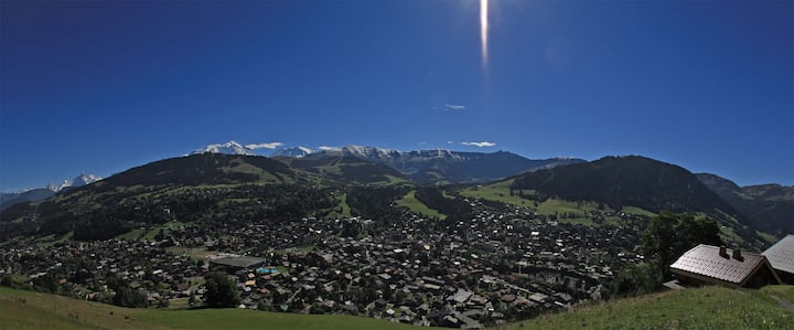 Le chalet, pouvant accueuillir 6 personnes, est situé dans un décor champêtre à 1 250 mètres d’altitude avec une très jolie vue sur le Mont-Blanc et le village de Megève.